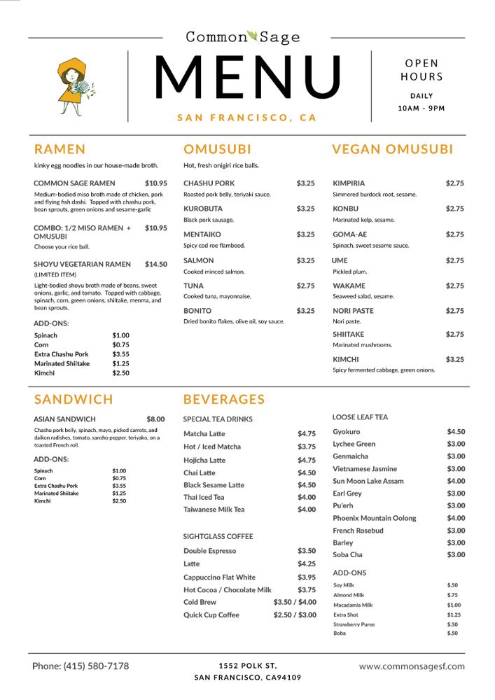 Common Sage, a cozy ramen cafe located in San Francisco, stands out for its extensive menu catering to vegetarians and vegans. With a focus on quality ingredients and unique flavor combinations, Common Sage offers a delightful dining experience. The onigiri and musubi options are a highlight, with 6 flavorful choices to satisfy your cravings. The ramen, known for its lighter broth, is a refreshing twist on the traditional Tonkotsu style. The service is prompt and courteous, and the outdoor seating on Polk Street provides a great spot for people-watching. The combination of a half-ramen and musubi is a must-try, showcasing the delicious offerings of Japanese cuisine at Common Sage. Overall, a hidden gem for those seeking a quick and satisfying meal without compromising on taste or quality.